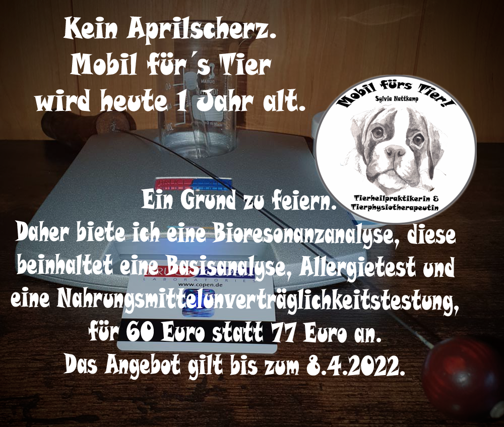 3. April 2022 0 Kommentare 15:16Kein Aprilscherz. Mobil für´s Tier wird heute 1 Jahr alt. Ein Grund zu feiern. Daher biete ich eine Bioresonanzanalyse, diese[...]